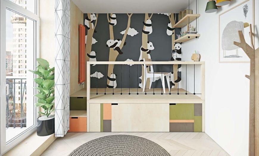 Если в квартире живет ребенок, необходима зона для детской. Для нее идеально подходит многоярусная мебель: внизу располагается письменный стол, вверху — кровать. В лесенку, по которой ребенок поднимается наверх, спрятаны выдвижные ящики для хранения небольших предметов. Рядом устанавливают шкаф, верхние полки которого отводят под одежду и личные вещи, а нижние — под игрушки.