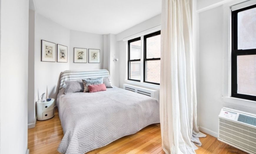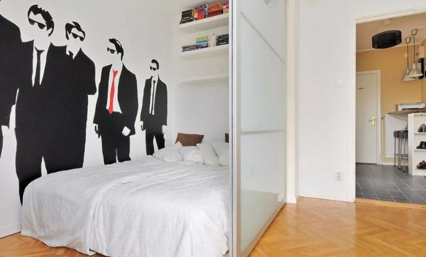 Зону для сна чаще всего размещают в углу студии, скрывая за дополнительной перегородкой или занавеской. Рядом ставят тумбу, на стены вешают стеллажи. В небольших квартирах используют встраиваемые кровати, на день прячущиеся в стене. В более свободных студиях спальное место отделяют высоким подиумом. Внутрь встраивают ящики для компактного хранения белья и личных вещей.