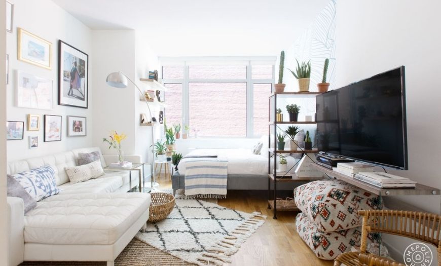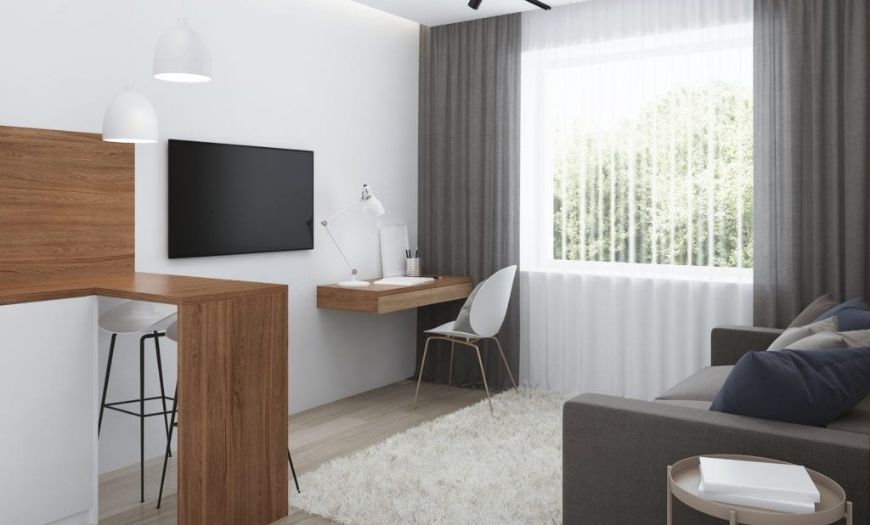 Эта зона отделяется диваном или небольшим шкафом-стеллажом. Напротив размещают телевизор: его можно повесить на стену или установить на тумбу или в шкаф-стенку. Если пространство позволяет, рядом располагают кофейный столик и кресло. На стене рядом организуют подвесные полки для книг и различных личных вещей. Для маленьких квартир часто покупают раскладной диван — тогда зона гостиной трансформируется в спальню.