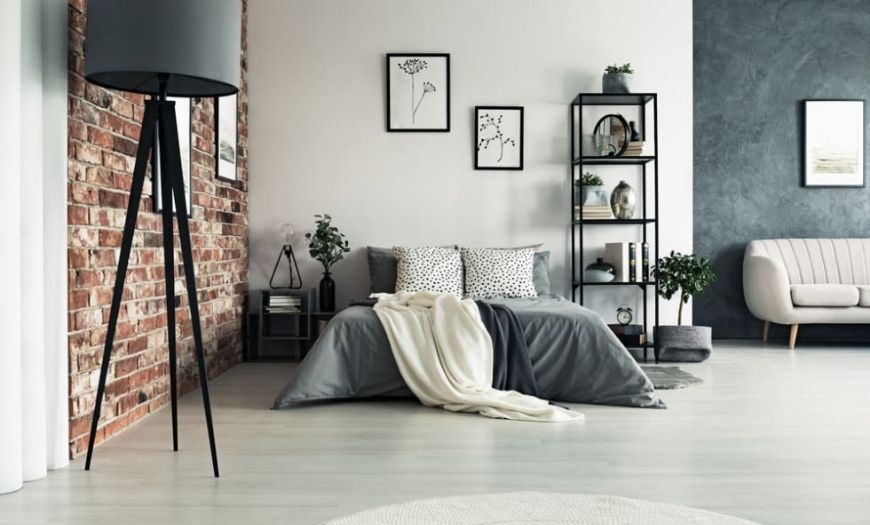 Отличный результат достигается при совмещении декора из естественных и синтетических материалов. Основные цвета, применяемые в этом стиле: оттенки белого, серого и черного, но темные цвета следует придавать только одной стороне стен. Вполне применимы оттенки дерева или кирпича. Бежевый цвет и светлые тона коричневого потеряли актуальность, в нынешнее время применяются совершенно другие приемы дать жизнь интерьеру небольшой спальни.