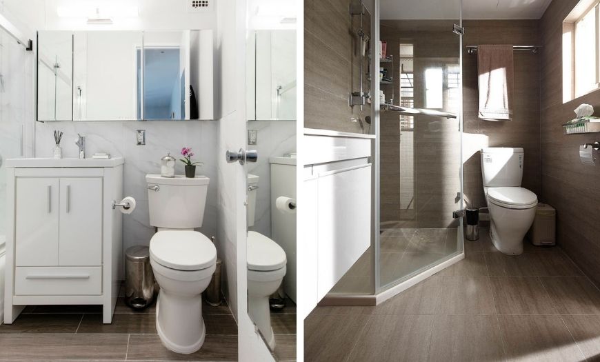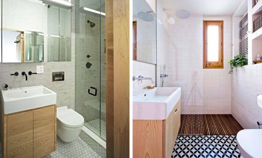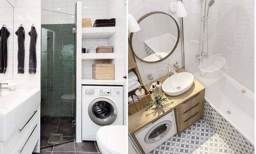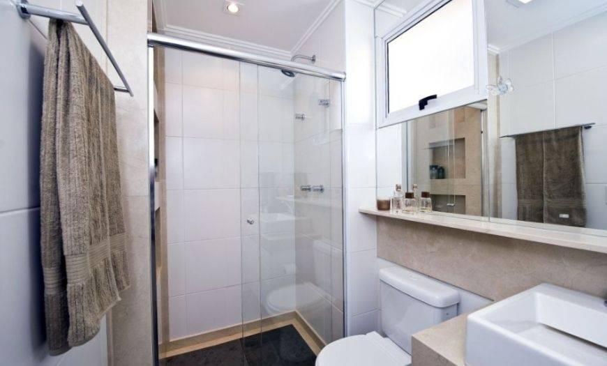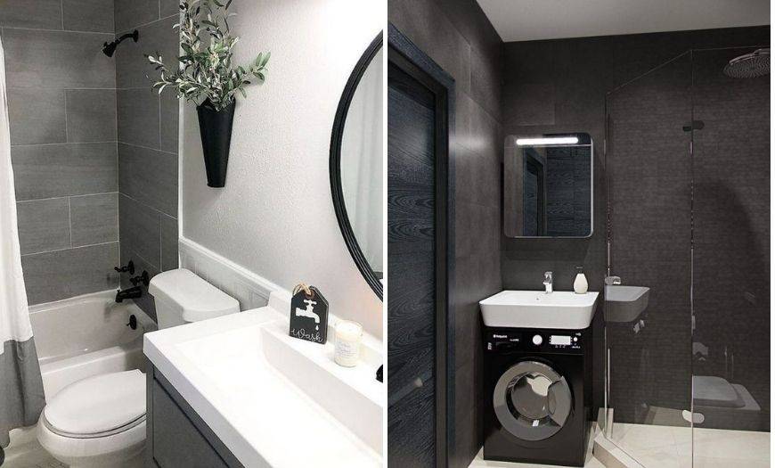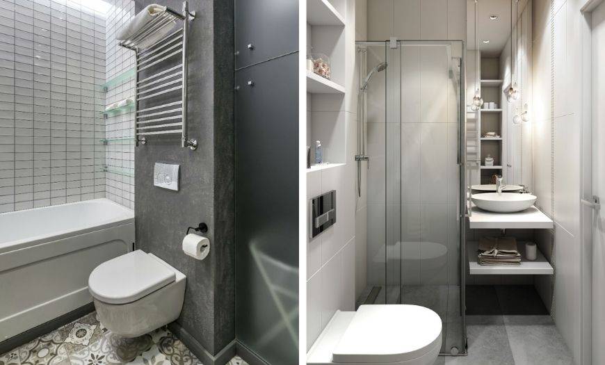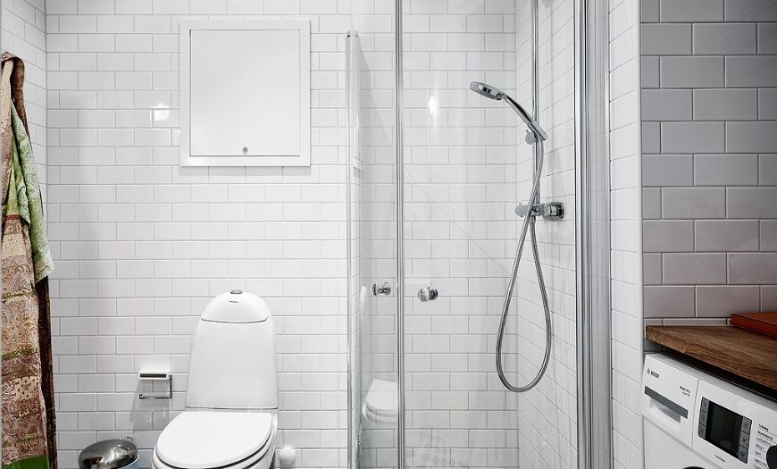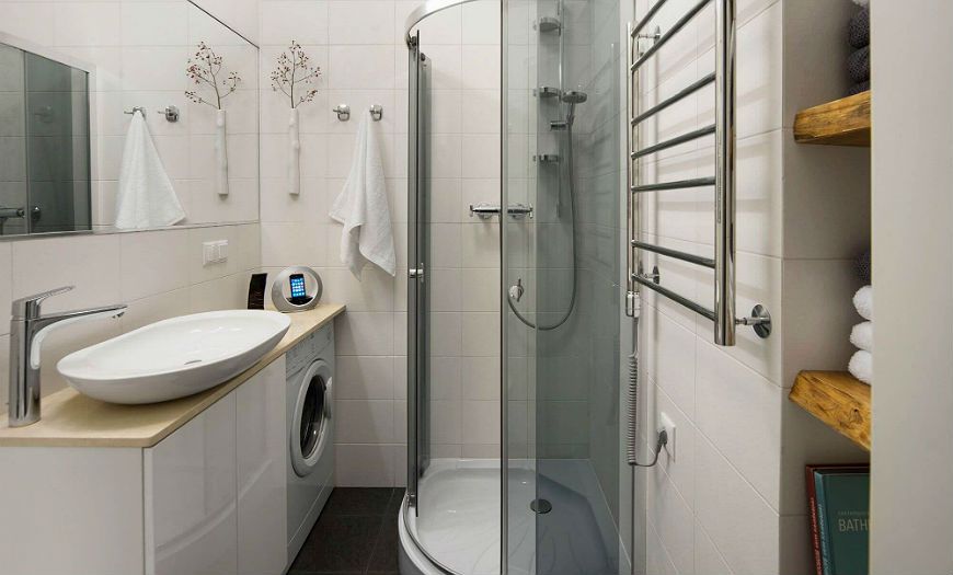 Санузел в квартирах-студиях чаще всего маленький, совмещенный, прямоугольной формы. Для него подойдет компактная сантехника: унитаз с системой инсталляции, встроенная раковина, душевой уголок или кабина. Хорошо смотрится вариант с сидячей или угловой ванной. Сушильную и стиральную машину располагают друг над другом для экономии пространства. Оставшаяся часть ванной отводится под полки, шкафы и прочие приспособления для хранения личных вещей. Дополнительно на стенах размещают различные вешалки и держатели.