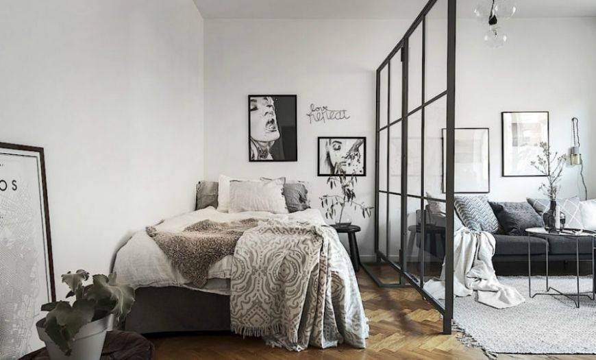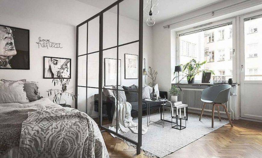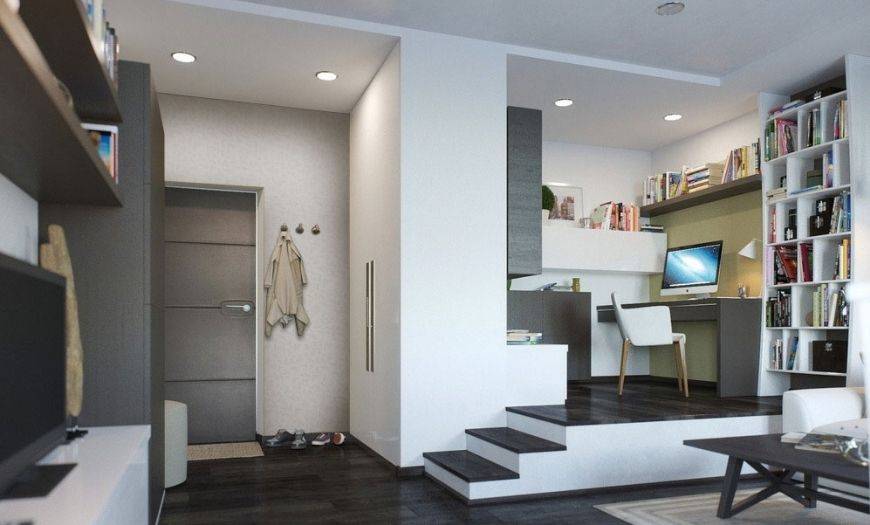 В целом в небольшом размере обстановка в стиле минимализм смотрится лучше. Стеллажи и шкафы не должны быть громоздкими. Замечательно, если на втором будут зеркала — они зрительно расширят пространство. Разделить площадь на функциональные зоны можно с помощью разного дизайна:
