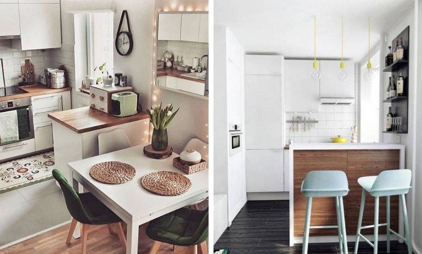 Обеденный стол и стулья выбирают компактные. Оставляют минимальное количество декора, чтобы не создавать ощущение загроможденности и беспорядка в маленьком пространстве.