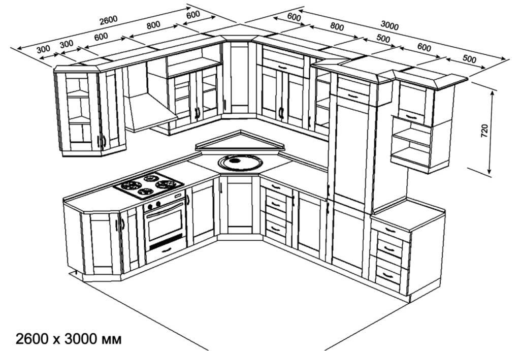 - Начертите мебель, привязанную размерами и конфигурацией к определенным местам кухни – угловой шкаф (его ширина должна составлять не менее 800 мм), варочную поверхность под вытяжкой, мойку рядом с канализацией и т. д.