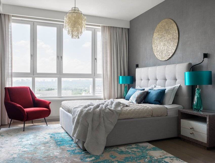 Серый станет подходящим фоном для создания ярких акцентов. В таком интерьере будут хорошо выглядеть покрывала, выполненные в приглушенных розовых тонах, бирюзовых, мятных и красных оттенках.