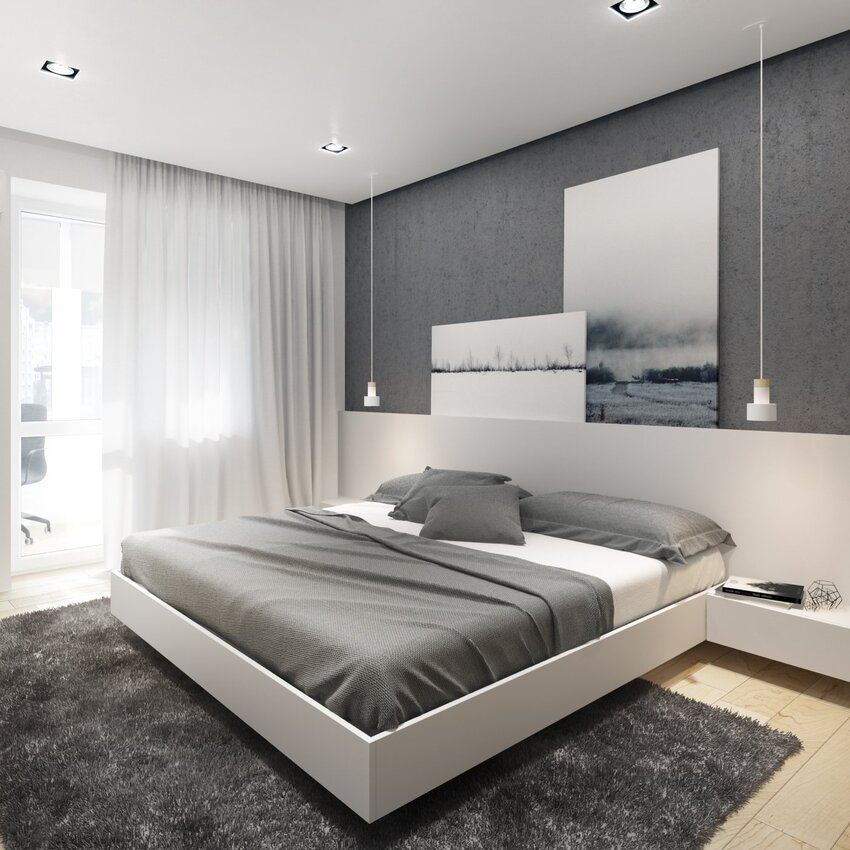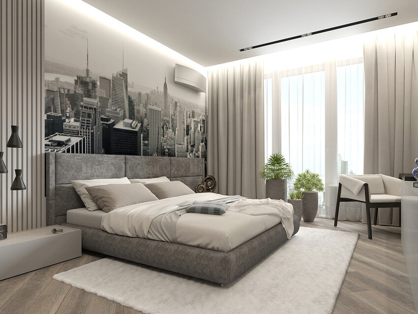 Ну и минимализм, перегрузив спальню множеством интерьерных мелочей исчезнет магия, создаваемая сочетанием серого и белого.
