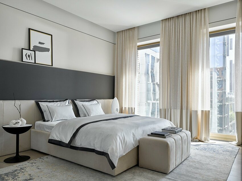 Убиваем двух зайцев сразу: высокая мягкая панель поможет немного звукоизолировать помещение и нивелирует визуальную аскетичность палитры.