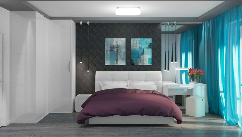 Этот цвет успокаивает и расслабляет, поэтому идеально подходит для такой комнаты, как спальня. Тем, кто желает внести в помещение романтические нотки, можно воспользоваться цветным освещением.