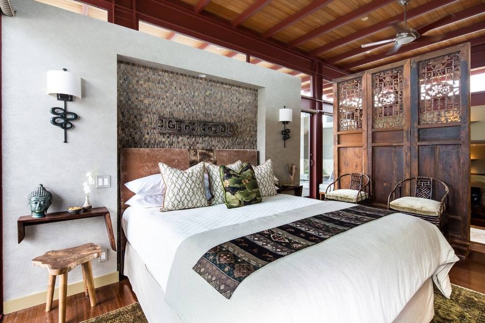 Если вы оформляете свою спальню в стиле азиатского минимализма, то очень гармонично в таком интерьере может смотреться матерчатая ширма. Впрочем, она также может хорошо вписаться и в средиземноморские мотивы оформления помещения.