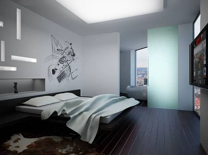 Для людей, ценящих необработанные, фактурные материалы и вдохновляющихся интерьерами а-ля складское помещение/гараж с открытыми коммуникациями, подойдёт спальня в стиле лофт, модерн, авангард, техно. Контраст – основа подобных композиций: