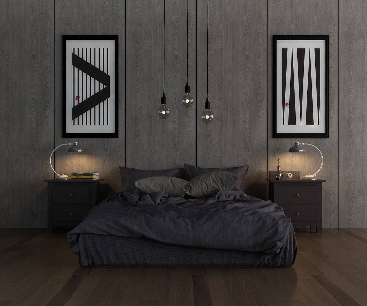 Начнем с брутального интерьера в мужской серо-коричневой гамме. Серые стены выступают хорошим нейтральным фоном для деревянной темно-коричневой мебели, черных тумбочек и шкафа. Насыщенный цвет мебели уравновешен светлым полом и покрывалом, комбинированными занавесками и черно-белыми картинами с подсветкой.