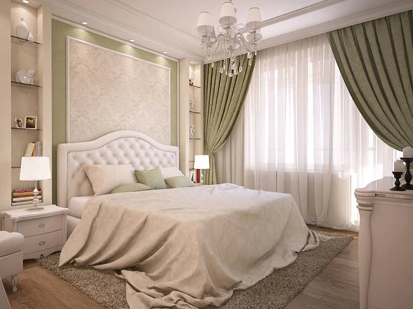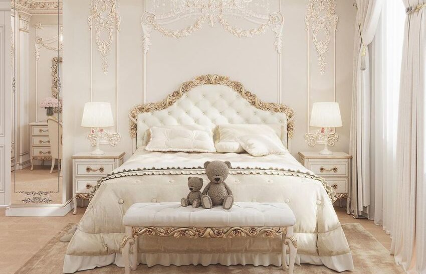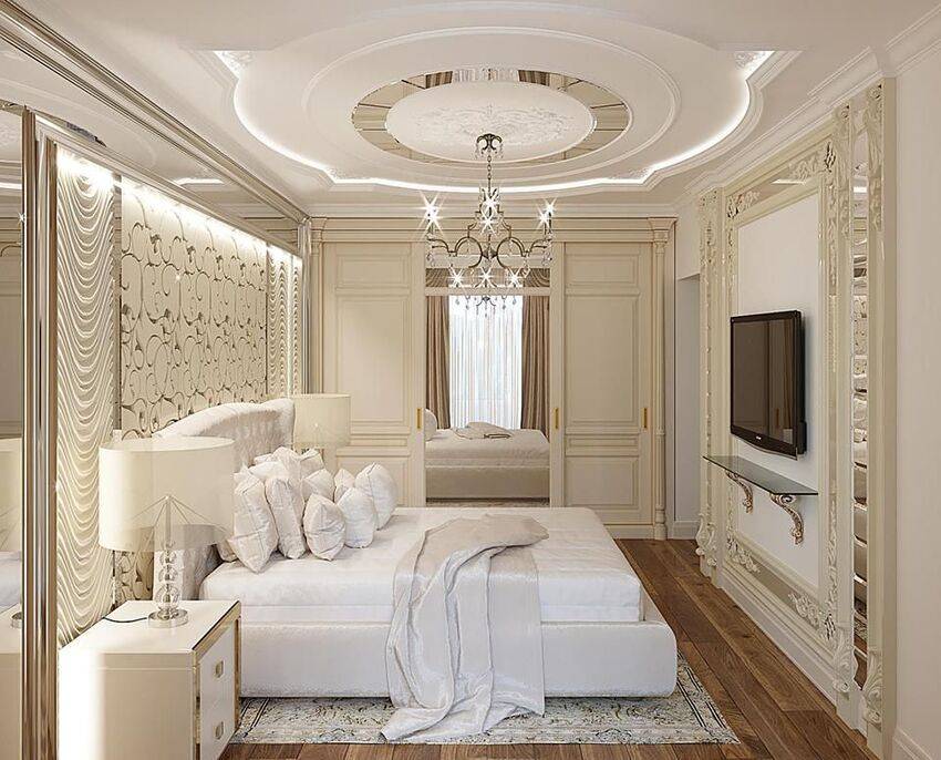 Интерьер комнаты в классическом и неоклассическом стиле сложно представить без роскошной хрустальной люстры. Добавьте к ней витиеватые ножки кровати и узорные ручки мебели