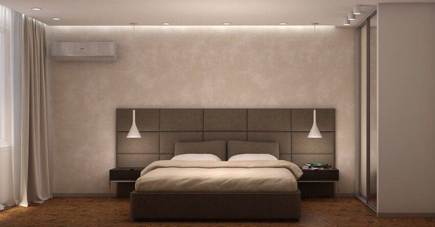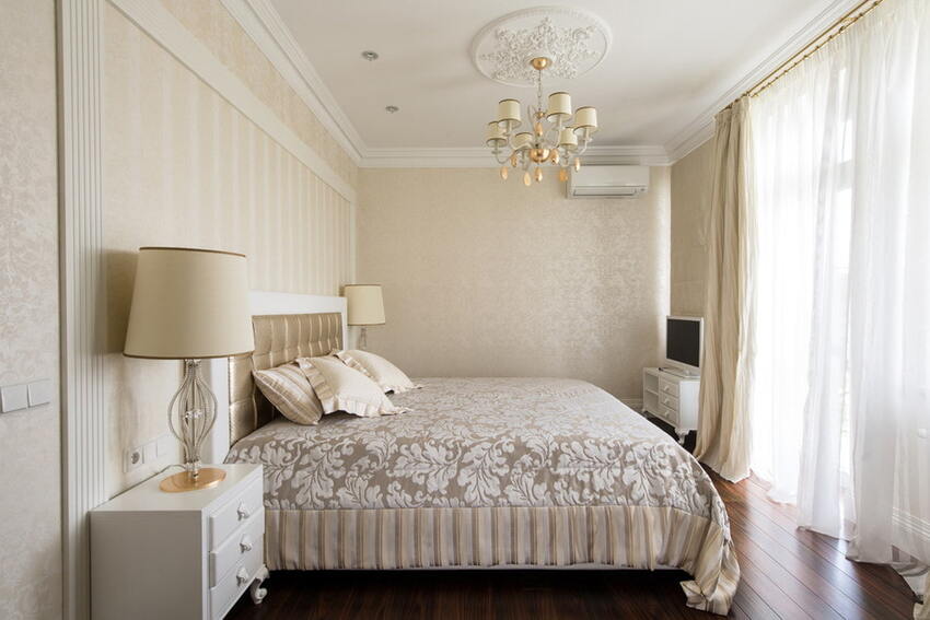 При оформлении спальни в бежевом цвете важно ориентироваться на то, чтобы стены, пол и потолок не сливались друг с другом. Для этого при отделке используются плавные переходы, препятствующие визуальной монотонности и превращению комнаты в единое пространство