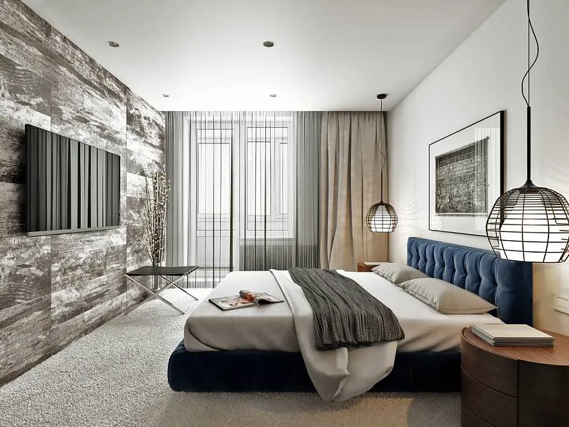 Голубой придает интерьеру свежесть и ощущение простора. Если вы выберете небесно-голубой – комната получится более нежной, это один из самых теплых оттенков. Васильковый, лазурный, морская волна – холодные тона, они уместны в хорошо освещенных спальнях. Разбавить интерьер можно серым, белым, темно-синим, светло-желтым. Сделайте акцент на простые формы и рельефные фактуры.