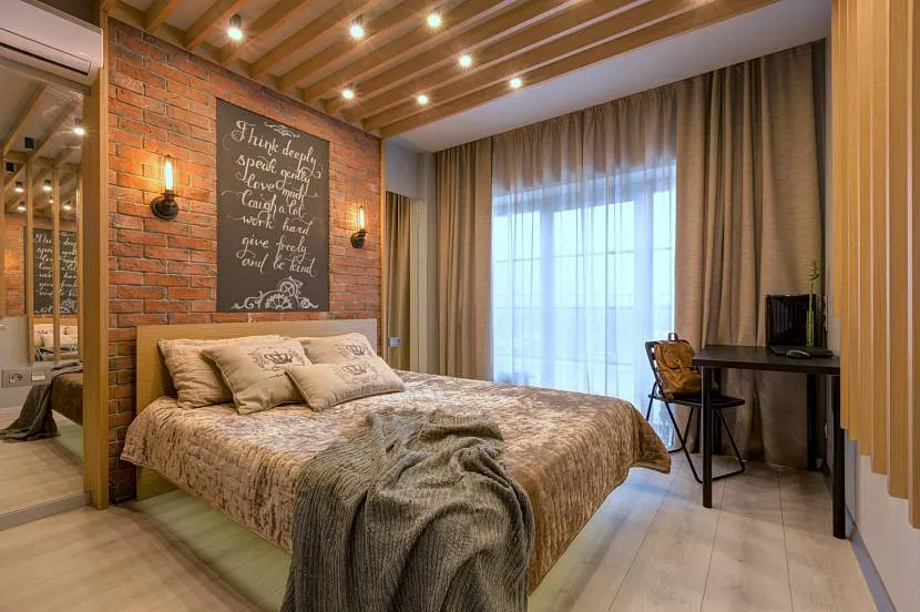 Стиль лофт при оформлении бежево-коричневой спальниИсточник design-homes.ru
