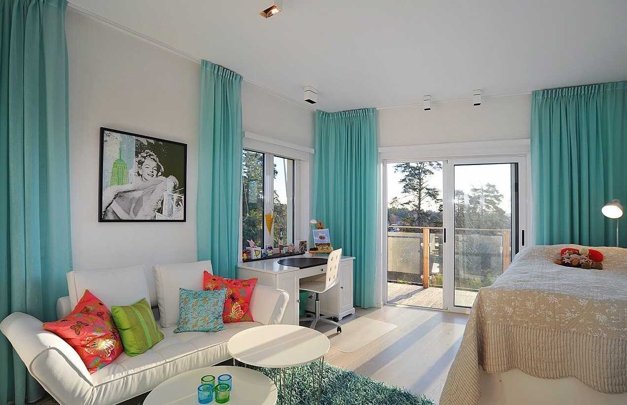 Бирюзовые шторы подчеркивают утонченный дизайн