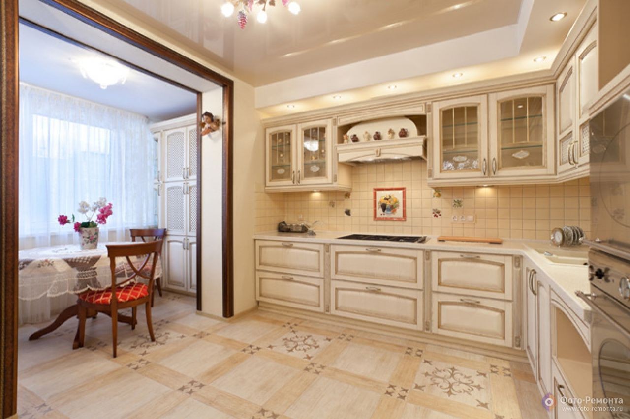 Если вас не пугают дополнительные финансовые затраты, то расширить кухонное пространство можно за счёт смежной комнаты или лоджии. Дверь можно заменить красивой полукруглой аркой. Ощущение простора добавит аналогичное кухонному оформление коридора.