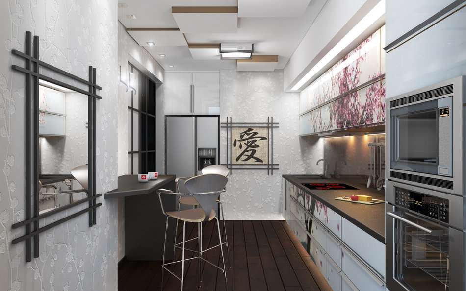 Самый обычный вариант оформления поверхности потолка – покраска или побелка. Но, если Вы хотите максимально приблизить дизайн собственной кухонной комнаты к японской индивидуальности, и дает возможность потолочная высота, можно соорудить довольно не простую конструкцию. Для этого вся потолочная площадь разбивается на квадраты, и фиксируются балки из дерева. Внутренняя часть может быть покрыта краской или оформлена матовым, текстурированным полистироловым полотном, а балки следует оставить в естественном виде.