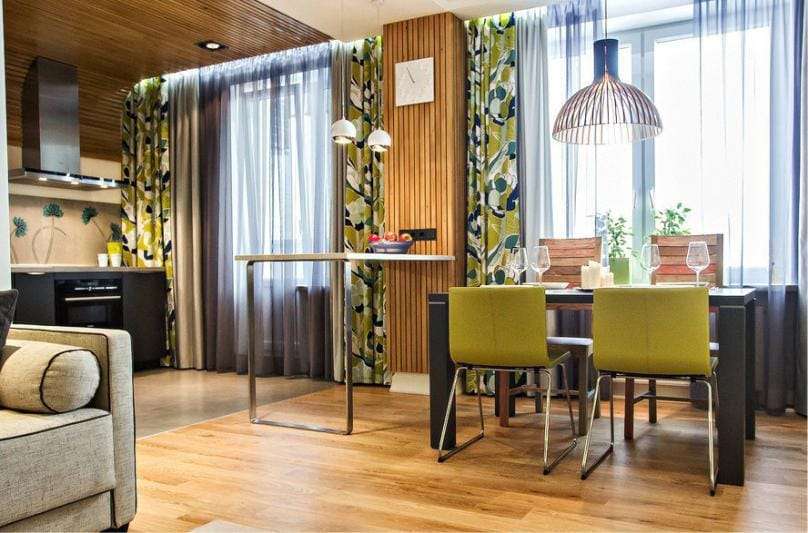 Довольно часто японский стиль выбирают для кухни-гостиной. В студийных интерьерах актуальна практика применения специальных ширм и перегородок для зонирования. Особенно популярны ширмы, сделанные из рисовой бумаги, способной пропускать свет через себя и делать помещение легким и уютным.