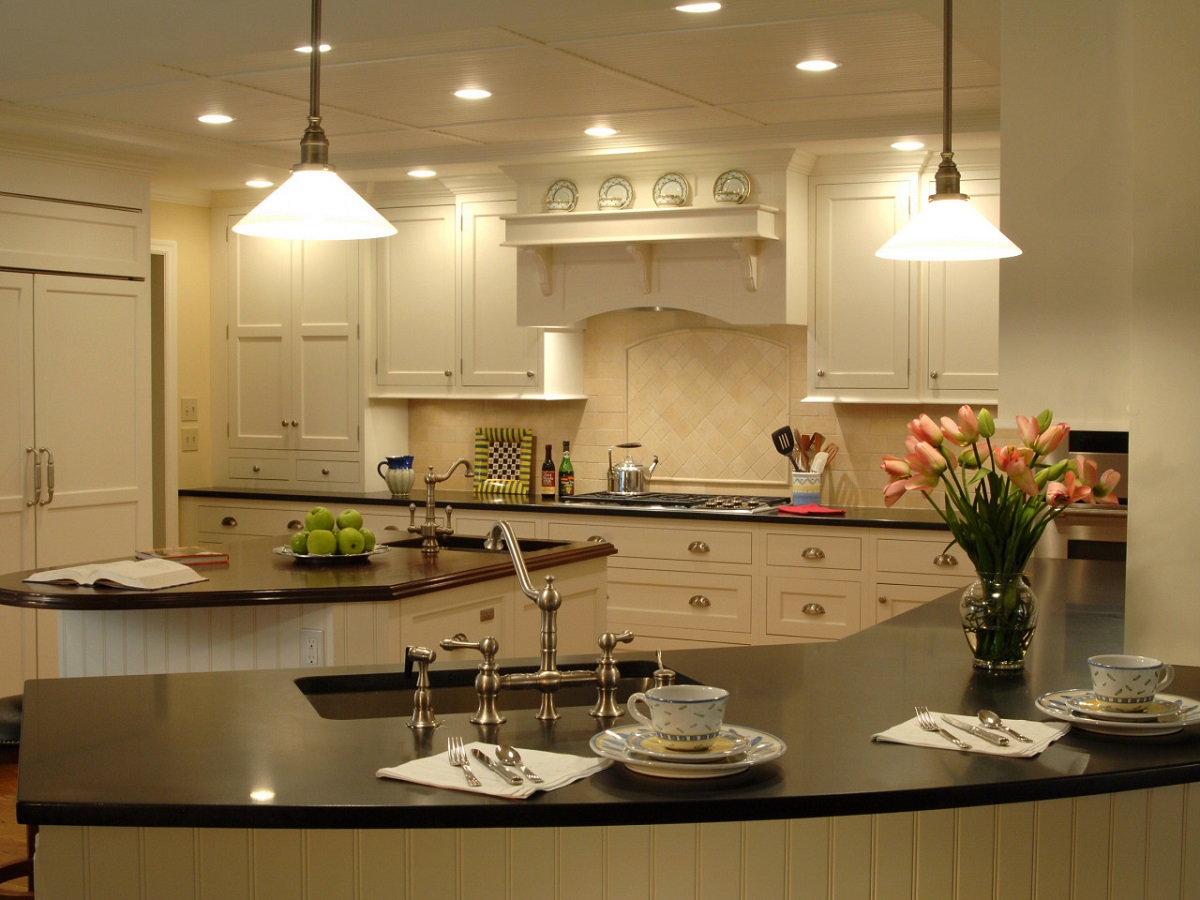 В классических кухнях часто используют сочетание черного и белого. В таком случае черную столешницу изготавливают из гранита или любого литого кварцевого материала. Но при этом нужно помнить, что при работе с мрамором есть проблемы с техническим обслуживанием.
