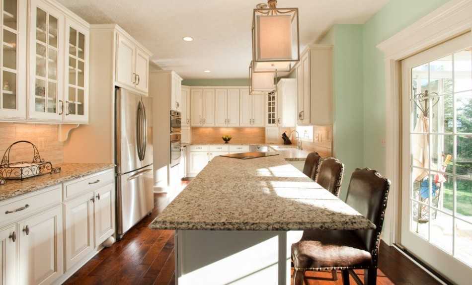 Не менее популярными вариантами для таких кухонь, является расположение мебели в виде буквы «Г» или «П», при этом обеденная зона может, расположатся возле окна или напротив, в самом начале комнаты, а на месте окна оборудуется рабочая зона для приготовления пищи.