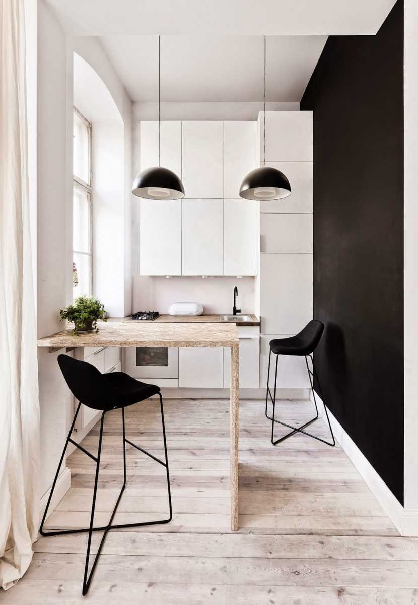 Чтобы сэкономить площадь, барную стойку сделали продолжением гарнитура. Такое решение идеально подходит для очень узкой комнаты. Альтернативный вариант – компактный стол-трансформер, который можно сложить и убрать, при необходимости.