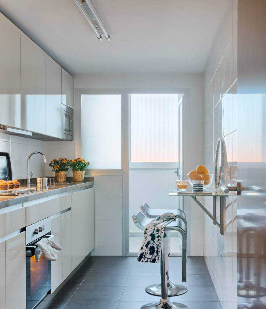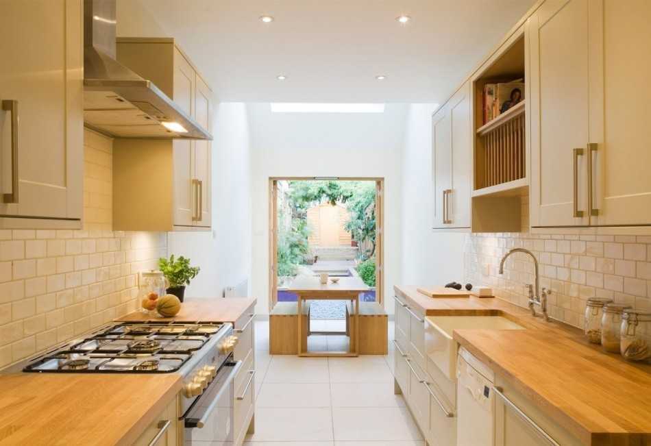 Очень узкое пространство кухни (шириной менее 2 м) подразумевает однолинейное размещение кухонного гарнитура, складывающуюся обеденную мебель. Чтобы уменьшить ширину столешницы, следует использовать бытовую технику миниформата, кухонные модули уменьшенных габаритов.
