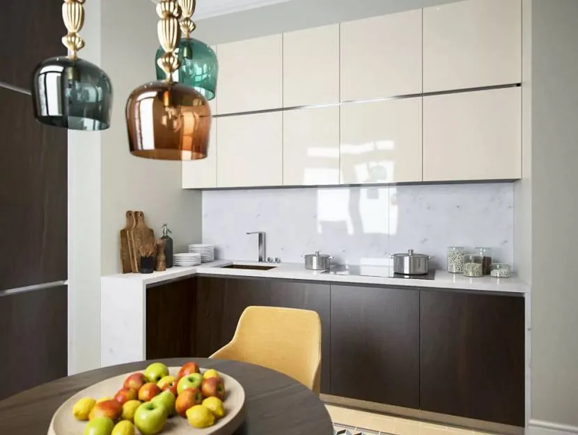 метров подойдет способ оформления интерьера «светлый верх», когда пол делают темным, а кухонный гарнитур с бытовой техникой выбирают светлых тонов. Так создается иллюзия открытого пространства и невесомости.
