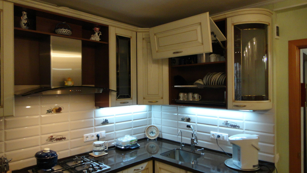 На фото кухня, неправильную форму которой сглаживает белый керамический фартук.