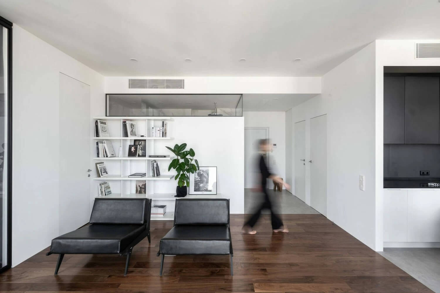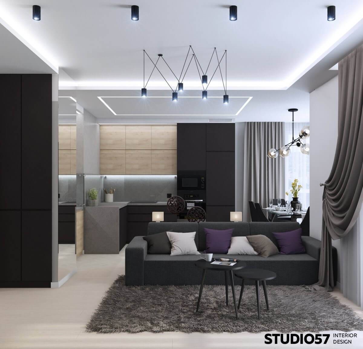 Минимализм часто играет на контрастах и может позволить себе тёмные и даже чёрные оттенки мебели и текстиля на фоне светлых стен, пола, потолка. Studio 57
