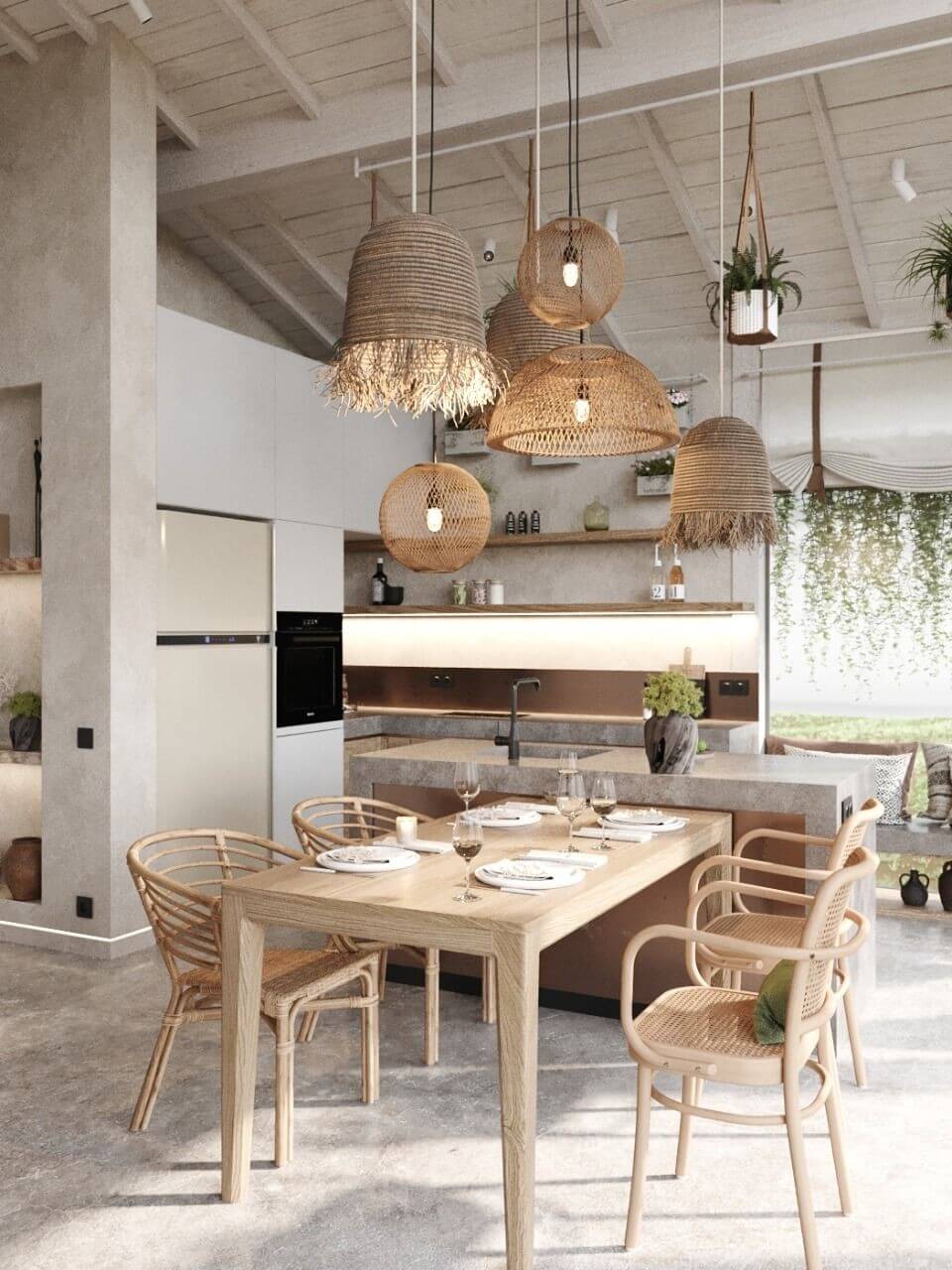 Ротанговая мебель и абажуры для светильников в сочетании с современной мебелью.