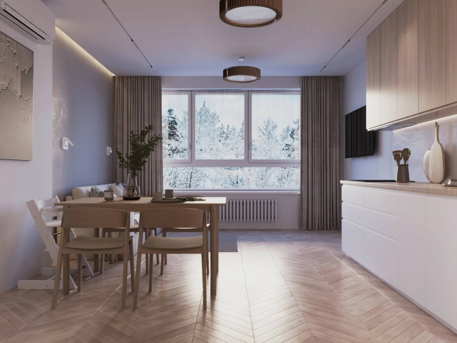 Чтобы современный интерьер начал излучать тепло и стал мягче, нужно добавить в него щепотку скандинавского хюгге: немного растений, тёплого света и деревянных фактур. Проект квартиры в ЖК «Зиларт», дизайнер Елена Мизотина
