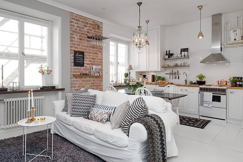 Классический вариант – белый цвет, используемый в качестве основы. К нему подбирают различные цветные атрибуты, текстиль, которые равномерно распределяют и в зоне кухни, и в зоне гостиной.
