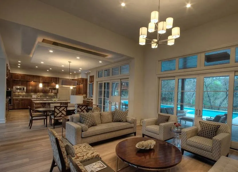 Также часто применяется и освещение. В гостиной оно должно быть самым насыщенным и ярким. Лучше всего подходят большие люстры.