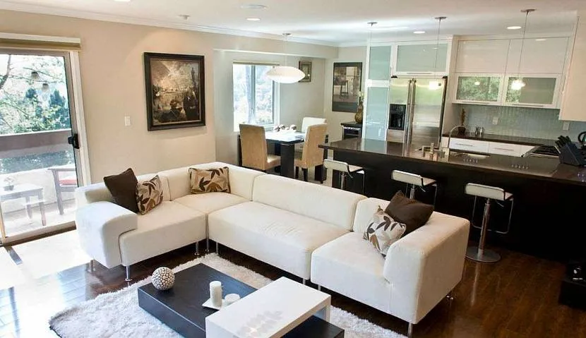 Обратите внимание! Отличным интерьерным переходом может служить – ступенька, которая отделяет кухонную область от другой. Предметы, расположенные на таком подиуме, зрительно помещены отдельно от диванной части для приема гостей