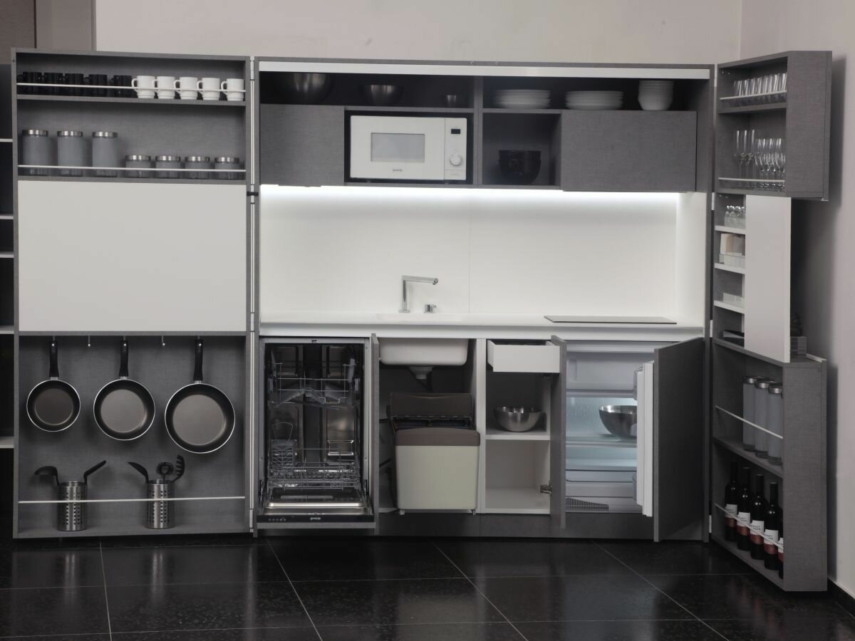 Привлекательное, но, прямо скажем, дорогое решение. Позволяет максимально сэкономить пространство и визуально исключить кухонную мебель из обстановки в квартире. Спрятать технику удается в шкафу, за красивыми фасадами или зеркалами.