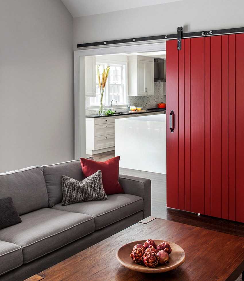 Однако, существуют и некоторые недостатки установки двери купе на кухню. Одним из них является плохая изоляция, касающаяся не только звуков и тепла, но и запахов. Ведь зачастую такая дверь не прилегает плотно к дверном проему. Альтернативным вариантом в таком случае становится установка раздвижной двери, которая будет въезжать в стену (см. пример на фото ниже).