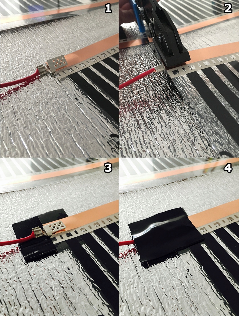 Подключается плёнка — для этого используются клеммы, которые есть в комплекте пола. На краю плёнки снимается изоляция с провода. Он сворачивается и просовывается в клемму, зажим фиксируется плоскогубцами. Затем место соединения изолируется битумным скотчем. Чтобы клеммы не возвышались в конструкции, для них так же проделываются углубления в теплоизоляции.