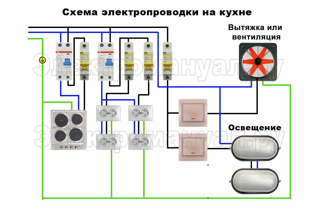 Чтобы правильно провести проводку в квартире и потом безопасно пользоваться бытовыми приборами на кухне актуально сделать электрощиток, который ставиться вместо классической распределительной коробки. Перед ним монтируется автоматический выключатель или стабилизатор напряжения, мощность которого выбирается выше каждого энергопотребителя в квартире. Туда же проводиться подключение розеток, главное выбрать правильно кабель для подключения. Освещение подключаем через автомат параллельно, чтобы включать и отключать сразу квартиру, а не по отдельности каждую лампочку.