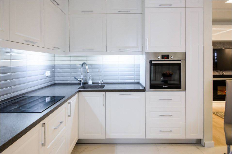 Владельцы однокомнатных квартир обычно устраивают в единственной жилой комнате спальню. Помещение кухни должно совмещать в себе кухню, столовую и гостиную. Отличным решением станет встраиваемая кухня с газовой плитой в углу. Мойка, рабочие поверхности, шкафчики располагаются вдоль двух стен. На оставшейся площади разместятся угловой диван, квадратный стол и 2– 4 стула. Маленькая кухня с плитой в углу позволит приготовить качественную пищу, устроить торжественный семейный обед или провести небольшую вечеринку.