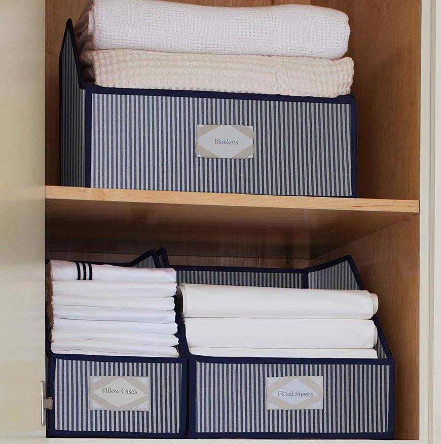 Можно использовать и такие категории как: взрослое белье (для двуспальной кровати), детское (для односпальной кровати) и гостевое. Чтобы отделить одну категорию от другой, нужно использовать разделители для ящиков или коробки.