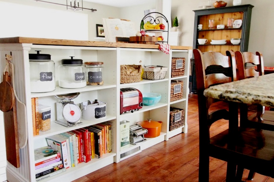 Чтобы не превратить свою кухню в складское помещение или поварскую подсобку, украсьте стеллаж парой украшений, например, вазой, комнатным растением, часами и даже картинами.