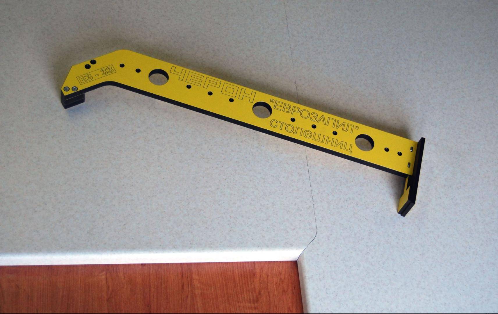 - Для облегчения задачи можно прикрепить к плите линейку, закрепив ее струбцинами (специальными соединениями для стягивания – соединителями столешниц), а саму плиту положить ламинированной поверхностью вниз – так будет меньше сколов.