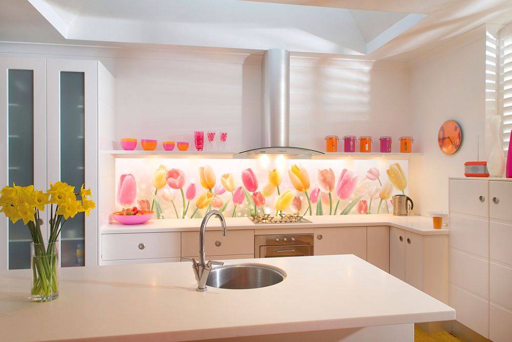 Другой вариант, когда стекло с обратной стороны декорируется рисунком или фотопечатью. Интересно смотрятся и фартуки с подсветкой.