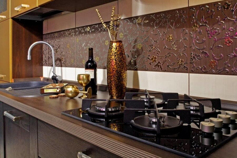 декоративная. Практичность и функциональность фартука могут вскоре стать раздражающим фактором, если вариант отделки непривлекательный и не вписывается в интерьер помещения.
