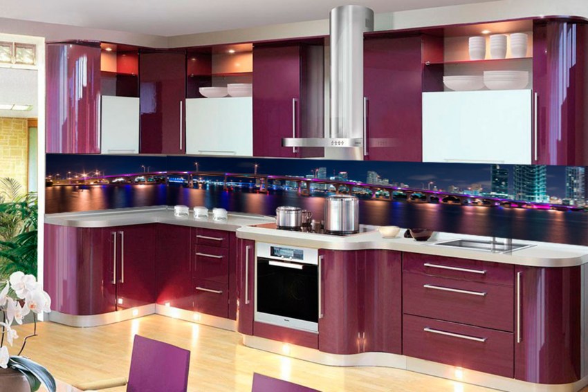 На фото фиолетовый фартук из триплекса с рисунком, оснащенный подсветкой. Он отлично гармонирует с потолочной светодиодной лентой в сиреневой гамме.