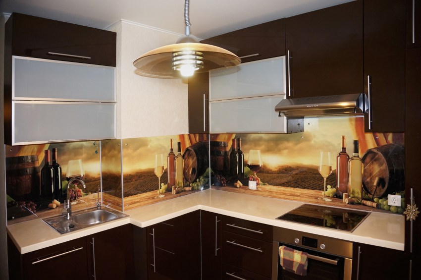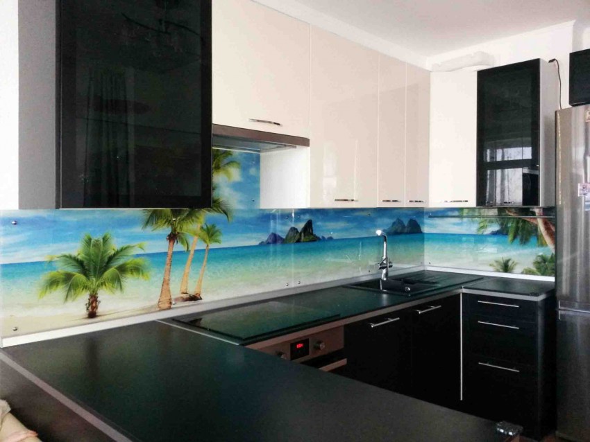 Этот материал позволяет оригинально оформить фартук для кухни. Можно выбрать практически любое понравившееся изображение. Главное, чтобы оно имело высокое разрешение. Производители могут использовать предоставленную фотографию, предложить собственный каталог или купить изображение на одном из стоков. Ранее рисунок наносили на поверхность методом шелкографии. Однако этот способ не слишком практичен, так как конечный результат получается недостаточно устойчивым к механическим повреждениям.