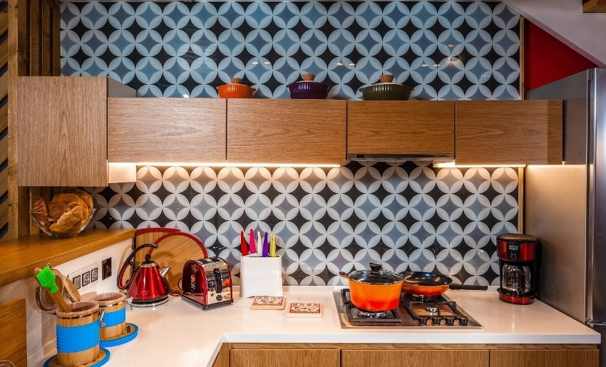 Можно повторить орнамент, если он есть в отделке стен или установить однотонный фартук