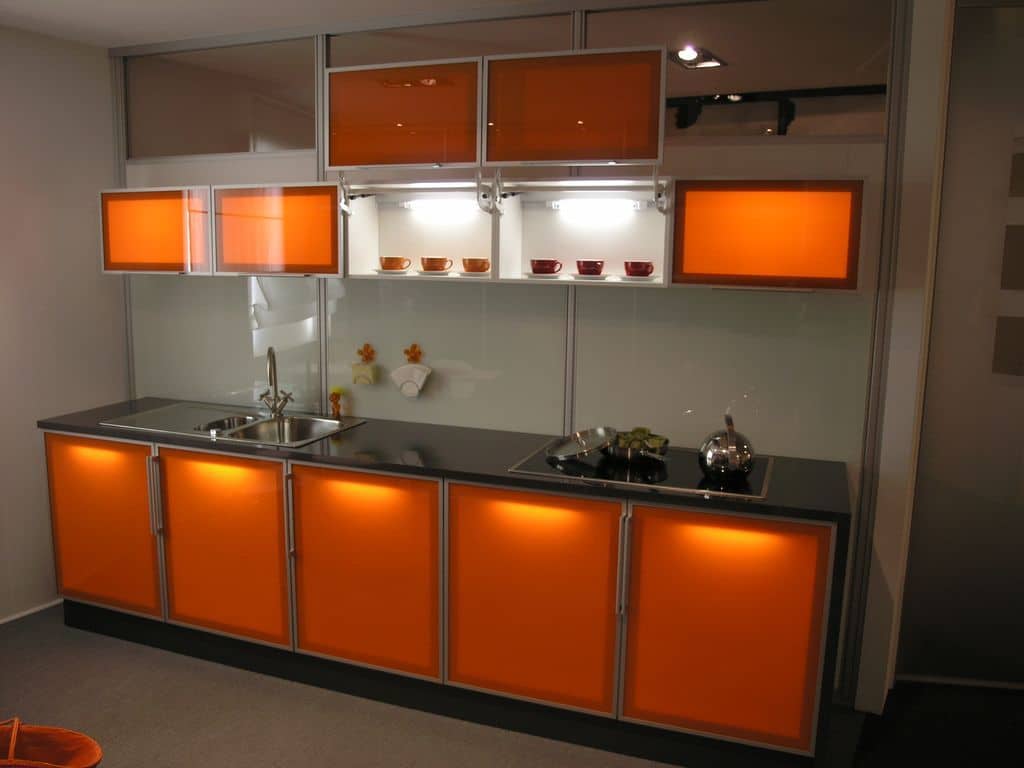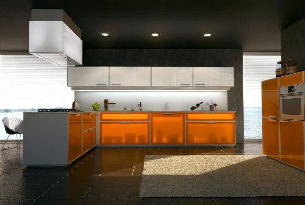 Все мы привыкли видеть использование керамической и стеклянной поверхности в части фартука или столешницы. Но время не стоит на месте и теперь данные материалы широко распространены в использовании на кухонных фасадах.