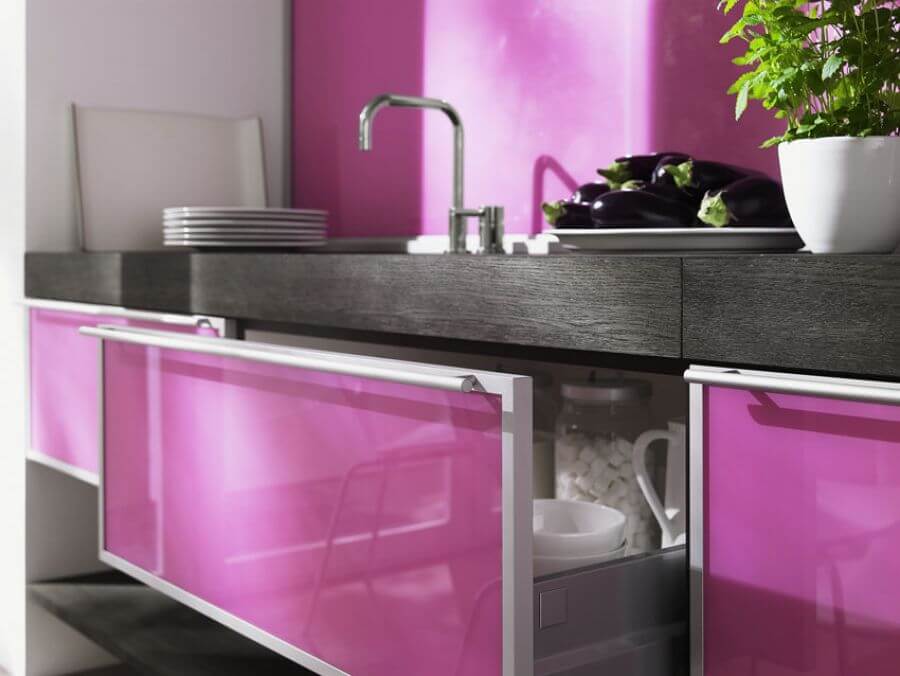 Алюминиевая рамка. В данном случае акриловые панели вставляются в каркас из алюминия. Такие фасады выглядят очень стильно, к тому же не теряют формы. Ширина рамы может варьироваться в зависимости от дизайна кухни: от тонкого, едва заметного обрамления, до толстых панелей